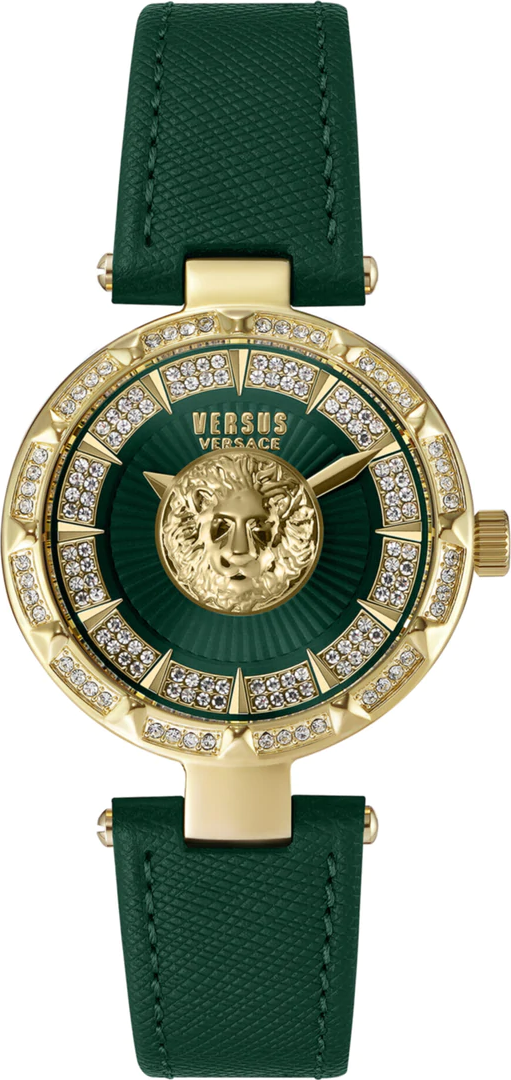 Logo Versus Versace mang tính biểu tượng và biểu tượng đầu sư tử 3D đóng vai trò là tâm điểm của chiếc đồng hồ này. Nó có các vòng pha lê lấp lánh nổi bật và thành phần thép không gỉ tông vàng vàng mạ ion mịn.