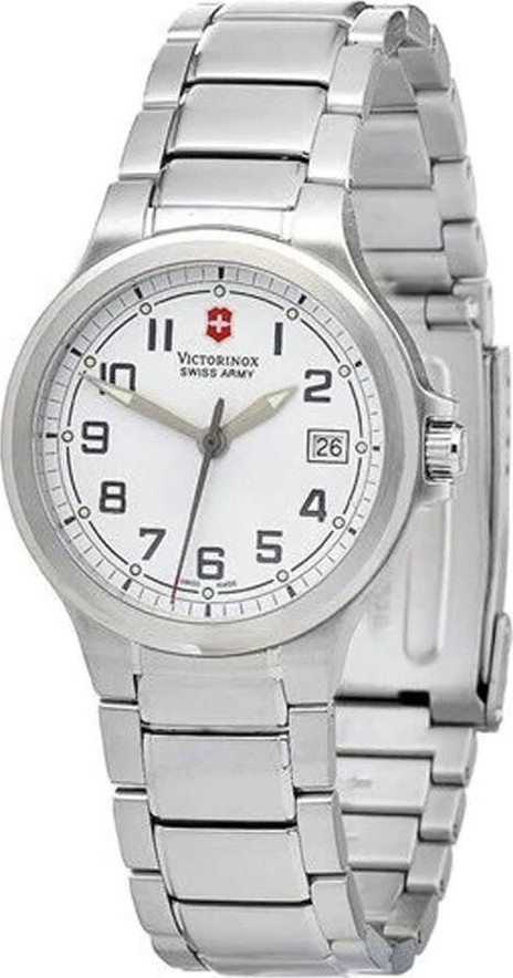 Vỏ thép không gỉ với dây đeo bằng thép không gỉ có điểm nhấn tông vàng. Vành bezel cố định bằng thép không gỉ. Mặt số màu trắng với kim màu bạc và vạch chỉ giờ bằng số Ả Rập. Vạch chỉ phút xung quanh vành ngoài. Kim và vạch chỉ giờ phát quang. Hiển thị ngày ở vị trí 3 giờ. Bộ máy thạch anh. Mặt kính khoáng chống trầy xước. Vặn chặt núm điều chỉnh. Nắp lưng chắc chắn. Đường kính vỏ: 34 mm. Độ dày vỏ: 8 mm. Kiểu dáng vỏ tròn. Chiều rộng dây đeo: 18 mm. Khóa gập có chốt an toàn. Chống nước ở độ sâu 100 mét / 330 feet. Chức năng: ngày, giờ, phút, giây. Kiểu dáng đồng hồ thường ngày. Nhãn hiệu đồng hồ Swiss Made.