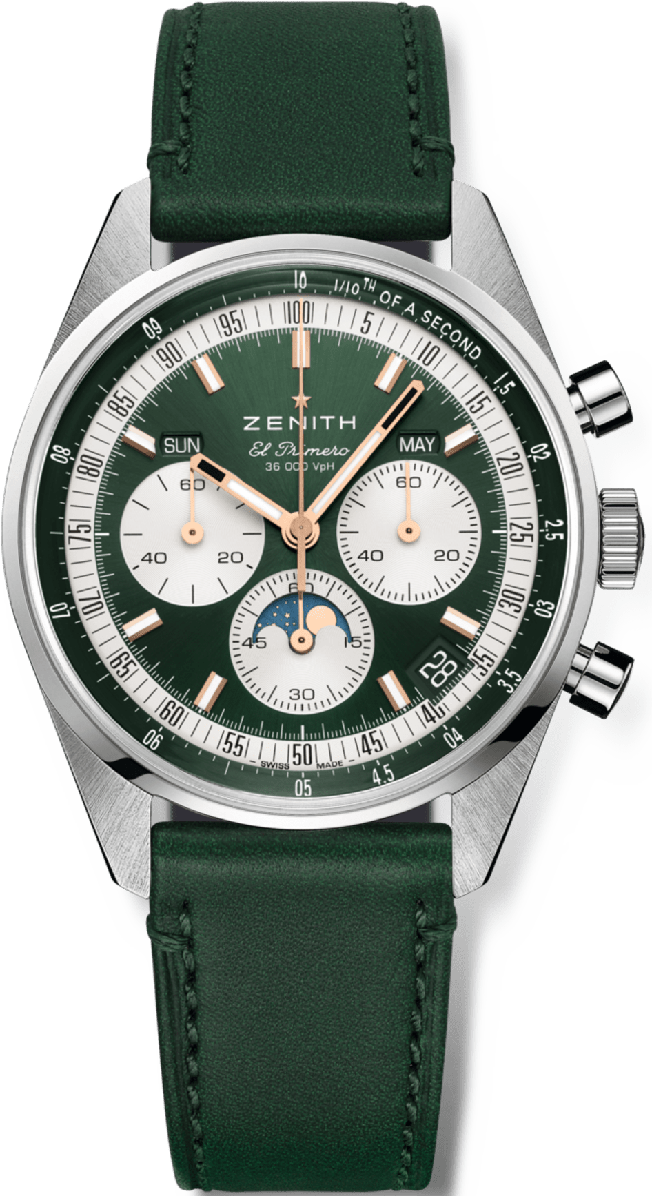 CHRONOMASTER Original Triple Calendar Boutique Edition được chế tác trong vỏ thép 38mm với dây đeo bằng da bê màu xanh lá cây, kết hợp với mặt số màu xanh ô liu sunburst hiển thị thứ, ngày tháng và pha mặt trăng. Được cung cấp năng lượng bởi bộ máy bấm giờ tần số cao tự động El Primero 3610 với chức năng bấm giờ 1/10 giây và dự trữ năng lượng 60 giờ. Bộ máy El Primero Components 366. Tần số 36.000 VpH (5 Hz). Dự trữ năng lượng xấp xỉ. 60 giờ. Giờ và phút ở trung tâm. Giây nhỏ ở vị trí 9 giờ. 1/10 giây Đồng hồ bấm giờ: