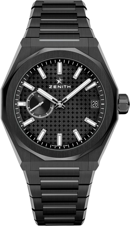 DEFY Skyline trong vỏ hình bát giác bằng gốm đen 41mm với vành bezel nhiều mặt, nổi bật với mặt số có họa tiết tia nắng mặt trời màu đen hình ngôi sao bốn cánh ZENITH biểu tượng. Được hỗ trợ bởi bộ chuyển động sản xuất tự động tần số cao El Primero 3620 với chỉ báo 1/10 giây đầu tiên. Vòng đeo tay bằng gốm có thể thay thế được, có dây đeo cao su có hoa văn màu đen.