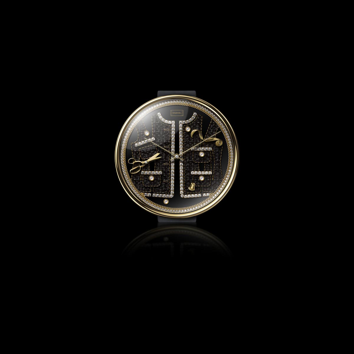Theo nghĩa đen và nghĩa bóng, chiếc đồng hồ thời trang cao cấp này là mẫu áo khoác vải tuýt màu đen, trang phục hàng đầu trong các bộ sưu tập của Chanel. Được hoàn thiện một cách hoàn hảo nhờ phần đầu kẹp, kéo và thước dây nổi bật bằng vàng gold, nó được trang trí bằng 92 viên kim cương.