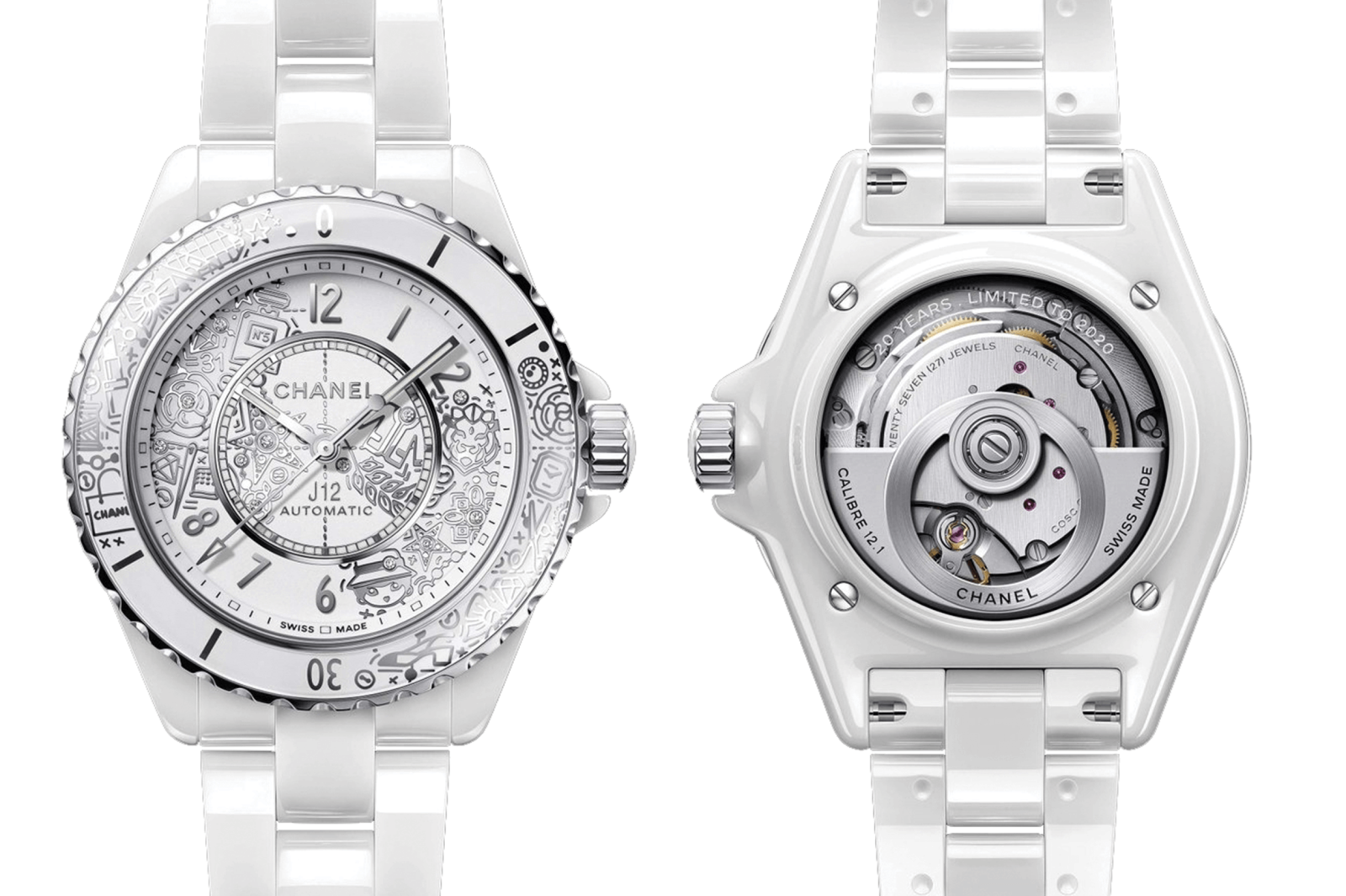 Bao gồm 20 biểu tượng và và tài liệu tham khảo từ maison Chanel: từ chiếc túi xách 2.55 xuất hiện từ năm 1955 và vẫn làm mưa làm gió trên thế giới thời trang hiện đại, cho đến hình ảnh hoa trà camellia - biểu tượng thời trang một thời, đến hình ảnh chai nước hoa Chanel No.5 danh tiếng hoặc sự xuất hiện của mô hình mẫu áo khoác vải tuýt đình đám, tất cả đều được lồng ghép khéo léo vào mặt quay số nhỏ bé nhưng chứa đựng những giá trị thời trang kinh điển suốt hàng thế kỷ qua. Và chúng ta cũng không thể bỏ qua 12 viên kim cương cao cấp cắt kiểu nhiều mặt với tổng trọng lượng là ~0.03 carat được Chanel đính rải rác trên khắp mặt đồng hồ tượng trưng cho con số 12 trong cái tên J12.