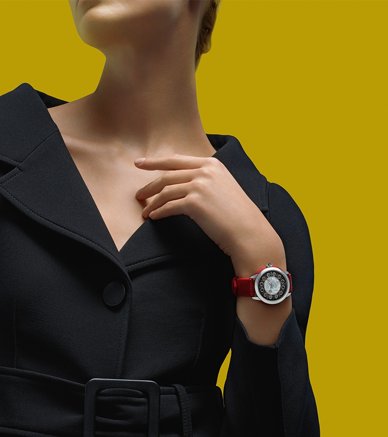 Đội ngũ thợ chế tác đồng hồ của Fendi Timepiece phải mất khoảng thời gian 3 năm để hoàn thiện nên công nghệ cho phép các điểm đánh dấu giờ có thể xoay và chuyển đổi từ kim cương trắng sang hồng ngọc, ngọc bích hoặc đá topaz nhiều màu. (Fendi cũng đang nắm giữ bằng sáng chế cho cơ chế phức tạp này).
